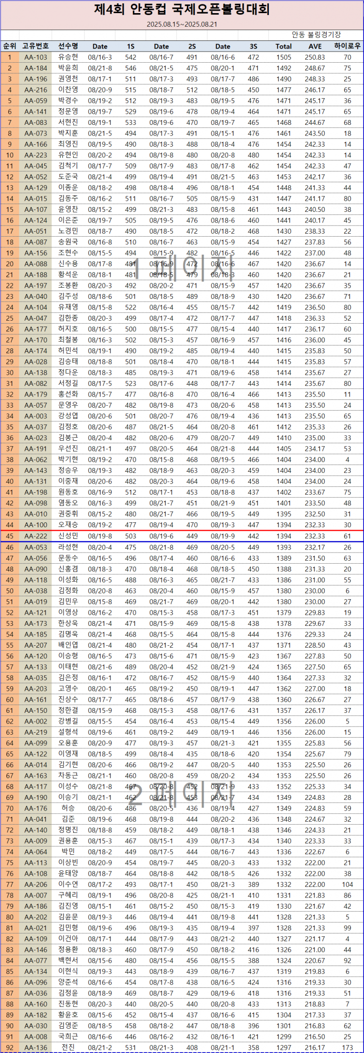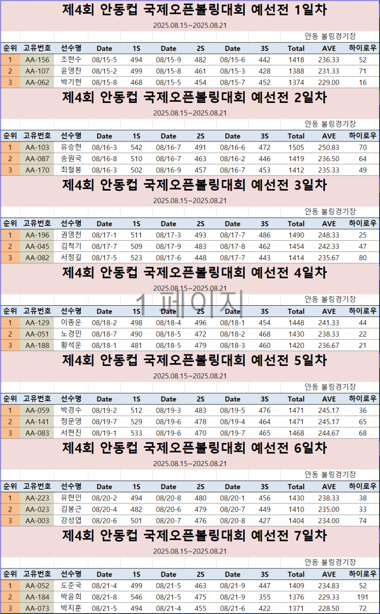 제4회 안동컵 국제오픈볼링대회 동호인부 7일차 성적(데일리 포함) 페이지 정보 작성자 한국프로볼링 작성일 25-08-15 21:10 조회 4,678회 댓글 0건 본문 *[제4회 안동컵 국제오픈볼링대회 동호인부] -최종결과- 동호인부 본선 진출 선수들은 25년 8월 22일(금) 24시 자정까지 우리은행 159-04-108335 (사)한국프로볼링협회로 본선참가비 10만원 입금해주시기 바랍니다. 관련 문의는 협회 사무국으로 (대표). ☎031-238-2086 연락바랍니다. 추천0 이전글제4회 안동컵 국제오픈볼링대회 오픈부 최종 진출자 명단 다음글제4회 안동컵 국제오픈 볼링대회 오픈부 예선 7일차 데일리 성적 목록 댓글목록 0 댓글목록 등록된 댓글이 없습니다.