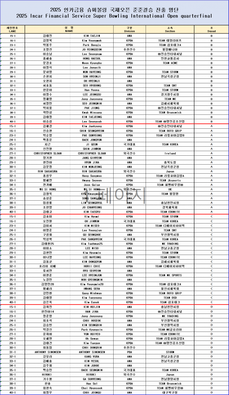 [명단] 2025 인카금융슈퍼볼링 국제오픈 준준결승 진출명단 페이지 정보 작성자 한국프로볼링 작성일 25-05-11 00:30 조회 2,208회 댓글 0건 본문 2025 인카금융슈퍼볼링 국제오픈 준준결승 진출명단 추천0 이전글[조배정&레인배정] 2025 원주컵 국제오픈 초청볼링대회 조배정 및 레인배정(수정 : 볼링파크 레인배정 변경) 다음글[일정변경 공지] 2025 인카금융슈퍼볼링 국제오픈 준준결승 / 준결승 세부일정 변경 목록 댓글목록 0 댓글목록 등록된 댓글이 없습니다.